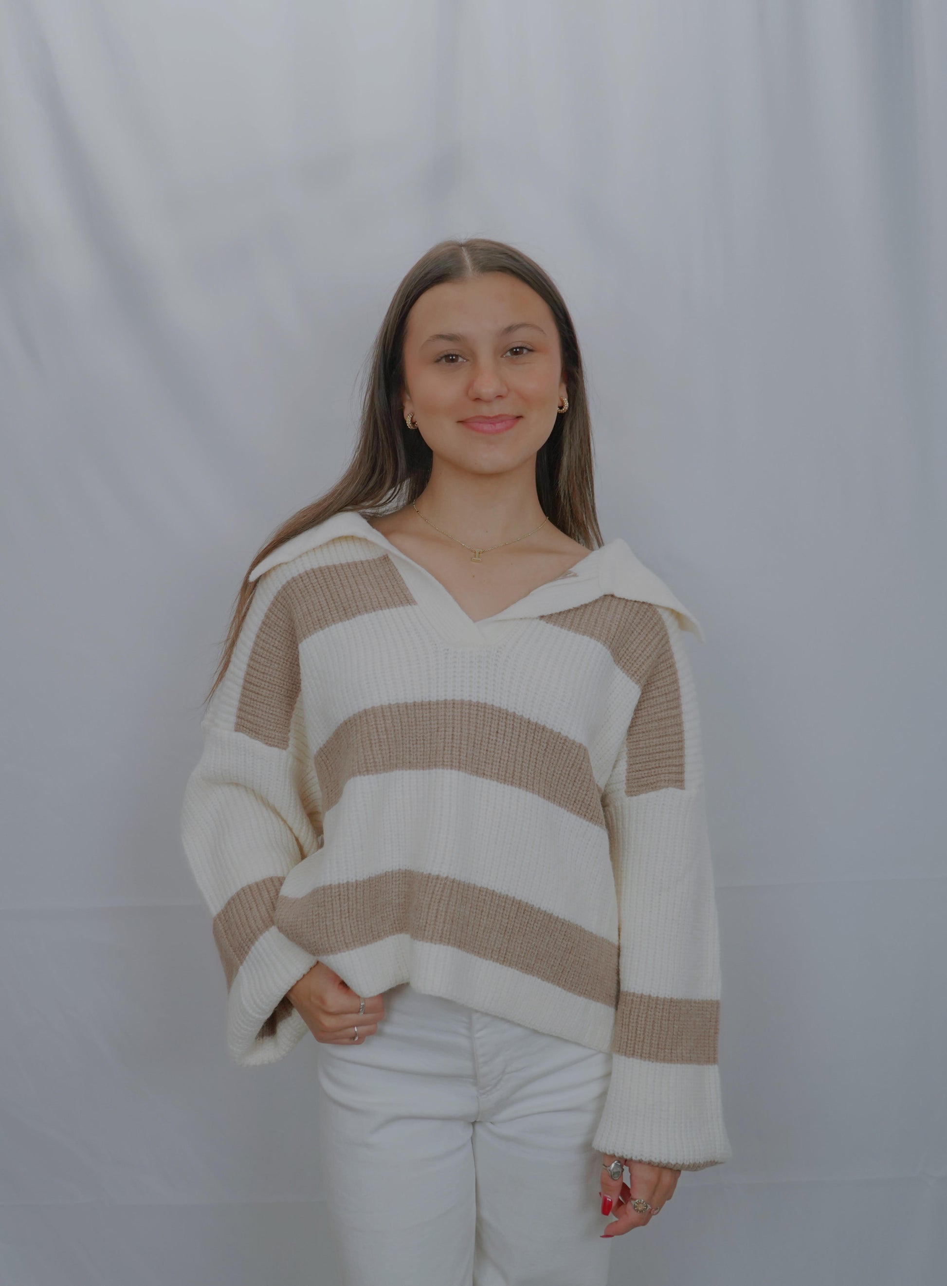 Stripe Drop Shoulder with Wide Collar Sweater - a perfect blend of comfort and style! This trendy sweater features eye-catching stripes and a chic wide collar, making a bold statement effortlessly. Designed with a relaxed drop shoulder for laid-back elegance, this sweater keeps you cozy and fashionable all day long. Crafted from high-quality materials, it offers a soft and luxurious feel, perfect for any occasion.
