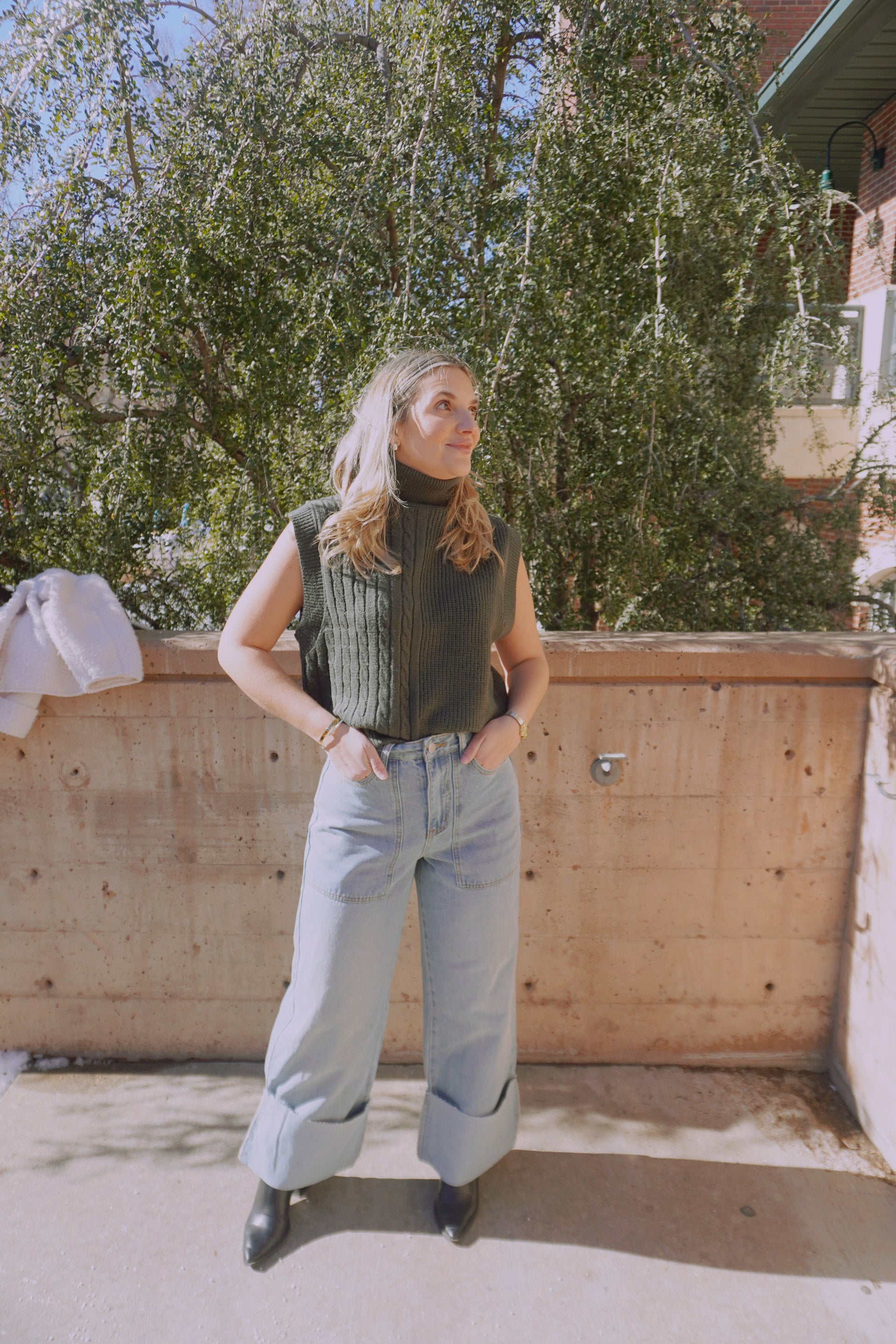 Meet The Cole Sweater! She is the perfect Winter to Spring transitional piece. This sleevless olive knit sweater is perfect for layering or great on its own.